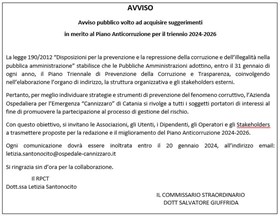 Avviso pubblico volto ad acquisire suggerimenti per la redazione e il miglioramento